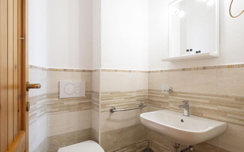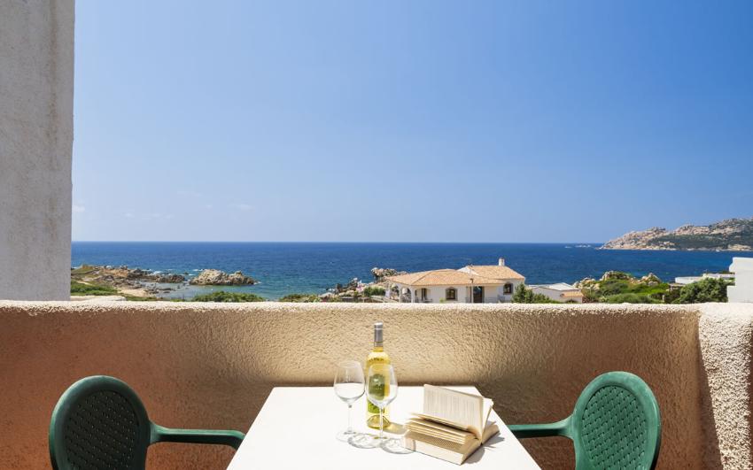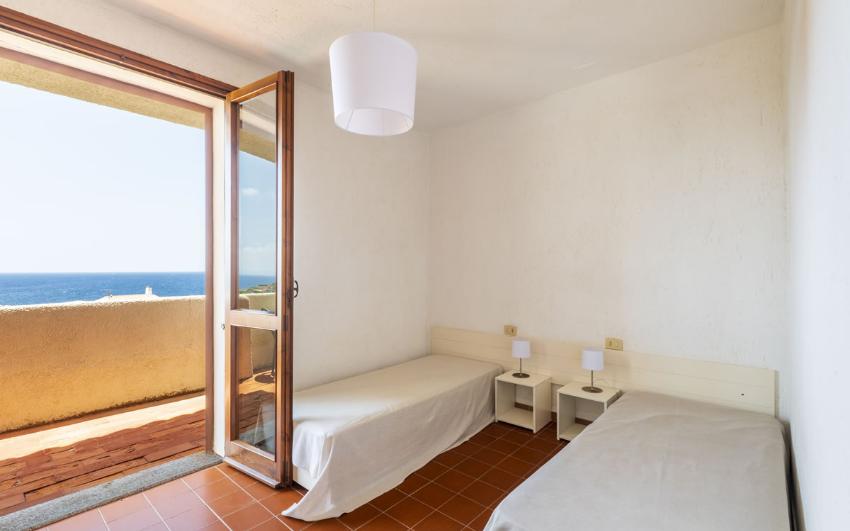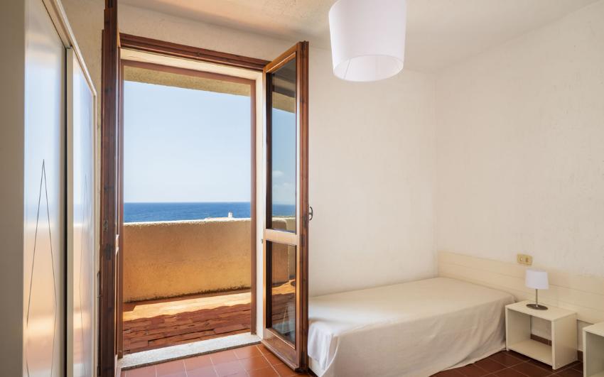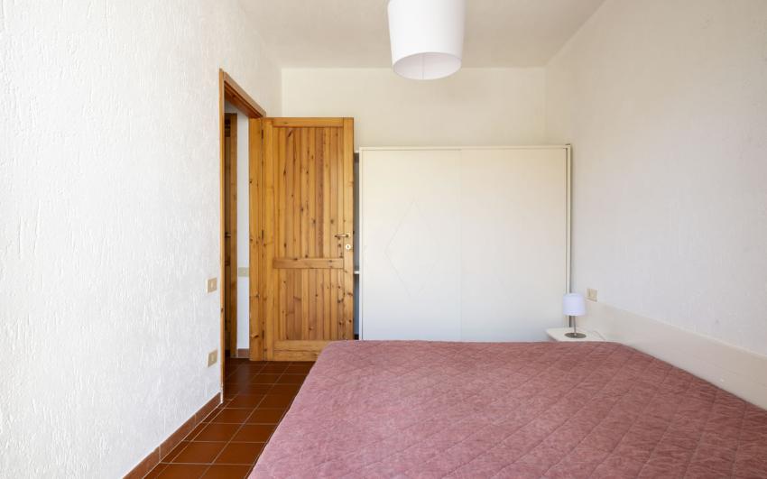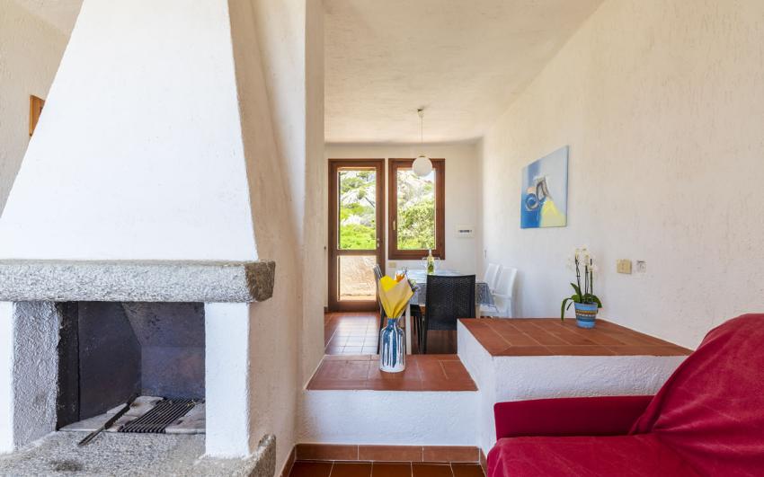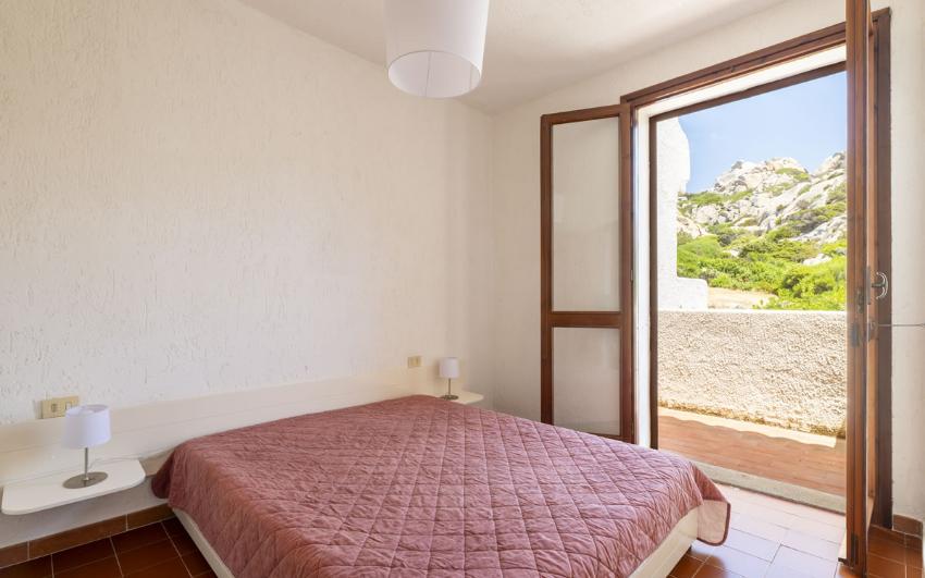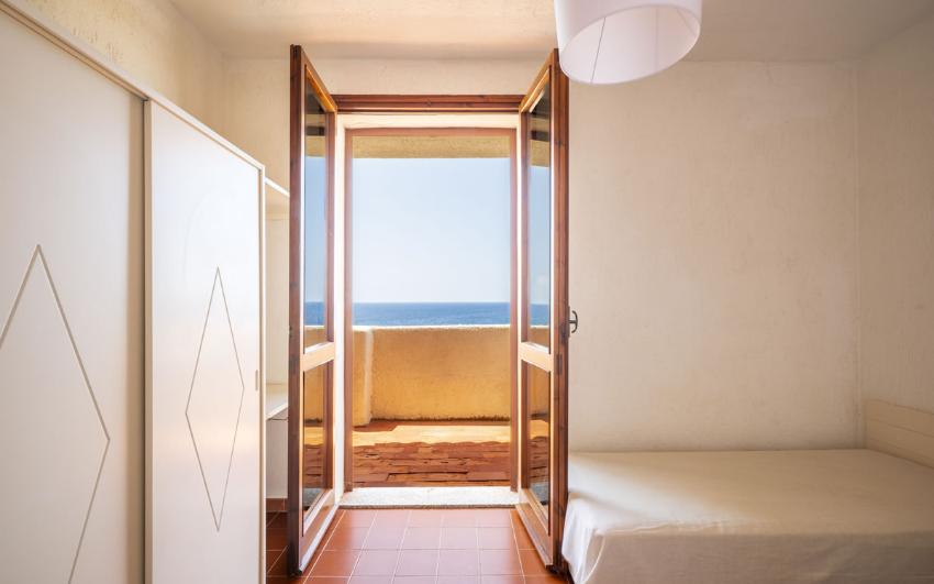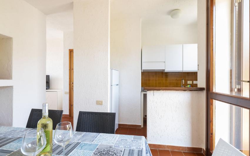 Consisting of a large and bright living room with kitchenette, double sofa bed, a spacious double bedroom and another bedroom with two single beds and sea view; very large balcony facing the sea. From the living room you can enjoy a wonderful view over the whole Bay and Capotesta. Equipped with two bathrooms (the secondary bathroom has only a toilet and sink). The three-room apartments on the ground floor have a garden for exclusive use with typical vegetation of the island, very shady and open. The photos of the apartments are purely indicative.